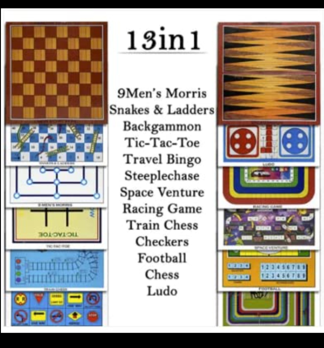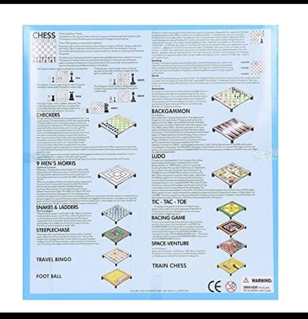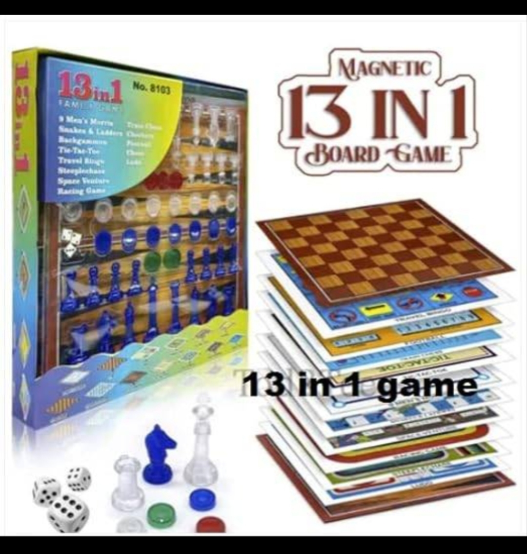 A Fun Game for the entire family. This 13 in 1 Game has all of your choices. Enjoy a splendid evening with your family and friends playing these games 13 in 1 family game: magnetic chess set with dices & resin chess magnetic pieces & colored resin pieces with removable stands which board games you can play: 1. CHESS 2. CHECKERS 3. 9 MEN’S MORRIS 4. SNAKES AND LADDER 5. STEEP & LADDERS 6. STEEPLECHASE 7. TRAVEL BINGO 8. FOOTBALL 9. BACKGAMMON 10. LUDO 11. TIC-TAC-TOE 12. RACING GAME 13. SPACE-VENTURE IN THE BOX: 5PCS CARD PAPER BOARD GAMES(PRINTED BOTH SIDES), 1PC MAGNETIC BOARD WITH BOTH SIDE PRINTED , 4 REMOVABLE CLIP STANDS, 2 PCS DOT DICE , 1 PC NUMBER DICE , 16 PIECES BLUE RESIN MAGNETIC CHESS PIECES. 16 PIECES TRANSPARENT MAGNETIC CHESS PIECES, 16 PIECES TRANSPARENT CHECKER COINS, 16 PIECES BLUE RESIN CHECKER COINS, 4 PIECES GREEN RESIN CHECKER COINS, 4 PIECES RED CHECKER COINS.