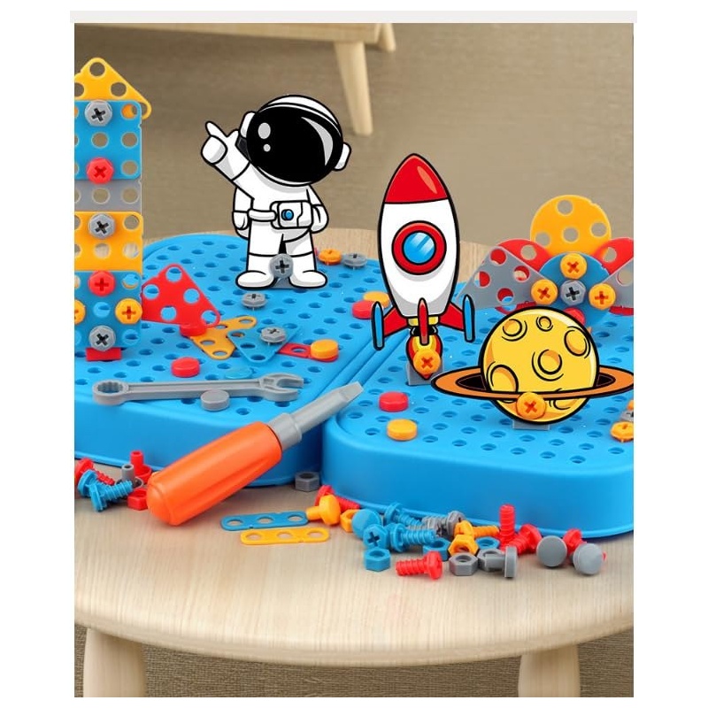 The set includes a kid-friendly electric drill, colorful screws, and multiple shape pieces, allowing children to build exciting 2D and 3D designs like animals, vehicles, space objects, and more. From dinosaurs to rockets, kids can create endless combinations while improving their imagination and problem-solving skills.